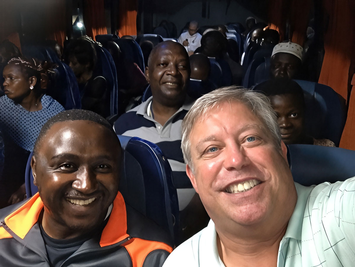 Bernard, Chip & Bienvenu to Gabon on a 12+ hour bus ride from Ngaoundere to Yaounde’ Cameroon.